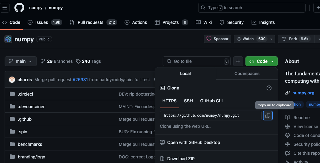 4. 깃헙에서 numpy 레포지토리를 로컬 레포지토리로 가져오기