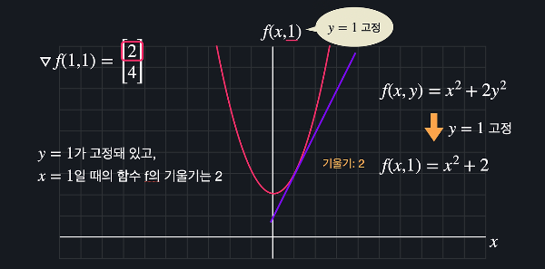 이 2라는 값을 구하기 위해 x에 대해서 편미분을 할 때 $y$ 를 상수라고 가정했는데 이는 $y$ 를 고정시켰다는 뜻이다. 이 2라는 값은 $y$ 를 1로 고정시킨다고 가정했을 때, $x$ 에 대한 함수 f의 기울기가 2라는 의미이다. 다시 말하면, $y$를 1로 고정시키게 되면 변수는 $x$ 하나밖에 없으므로 아래와 같은 2차원 그래프를 그릴 수 있는데 이 2차원 그래프에 그려지는 이 함수의 기울기가 2라고 볼 수 있다.