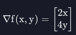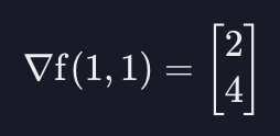 만약 $x$ 가 1이고 $y$ 가 1인 지점의 기울기를 알고 싶다면, 그 값들을 여기에 대입하면 된다. 그러면 벡터에는 2랑 4가 들어가게 된다.