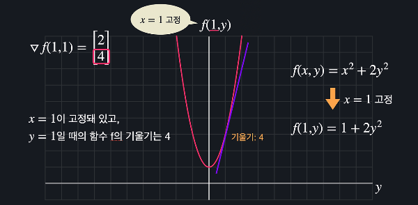 마찬가지로 4라는 값을 구하기 위해 $y$에 대해 편미분을 했는데, 이는 $x$를 고정시켰다는 뜻이다. 즉, $x$를 1로 고정시킨다고 가정했을 때, $y$에 대한 함수 $f$의 기울기가 4라는 것이다. $x$를 1로 고정시키면, 변수는 $y$ 하나밖에 없으므로 아래와 같은 2차원 그래프를 그릴 수 있는데 여기에 그려지는 함수의 기울기가 4인 것이다.
