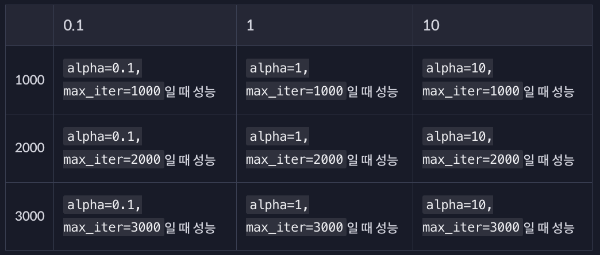 예를 들면, Lasso 회귀 모델을 기준으로 alpha와 max_iter값을 찾기 위해 아래와 같은 표를 그리게 되는데 표의 원소들을 해당 행과 열에 있는 하이퍼 파라미터 조합으로 모델을 학습시켰을 때의 성능으로 채워준다.