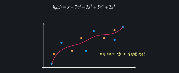 손실 함수의 아웃풋이 작을수록 더 좋은 가설 함수고, 클수록 더 좋지 않은 가설 함수라고 할 수 있는데, 위처럼 다항 회귀는 평균 제곱 오차를 손실 함수로 사용하므로 "training데이터에 대한 평균 제곱 오차가 작을수록 좋은 가설 함수다"란 의미가 된다.