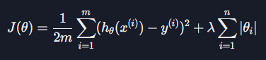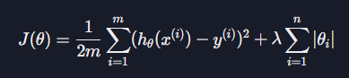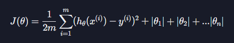 이걸 수학적으로 표현해보자면 손실 함수 J는 값이 클수록 가설 함수가 안 좋다는 뜻이기 때문에 아래와 같이 손실 함수에 θ값들의 절댓값, 또는 크기를 더해주면 된다.