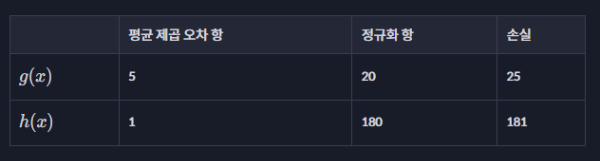 가설 함수 g는 데이터에 대한 평균 제곱 오차는 h보다 크지만 θ값들이 훨씬 작기 때문에 더 좋은 가설 함수라고 평가하는 것이다.