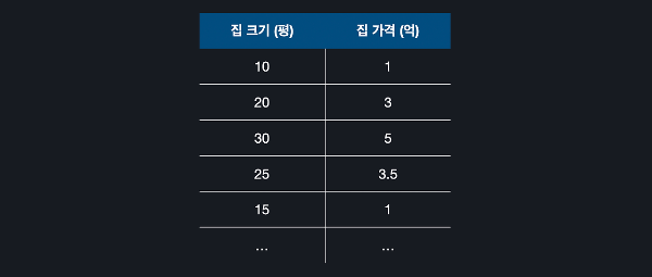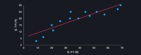 예를 들어서 집 크기가 집 가격과 어떤 관계인지 이런 식으로 데이터가 있다고 하자.