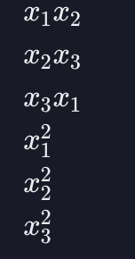 아무튼 일단은 이차항까지만 있다고 가정하는데, 이차항이란 뭘까? 이차항은 변수 두 개가 곱해진 것이다. 예를 들어서 $x1$ 제곱도 이차항이고, $x1$과 $x2$를 곱해도 이차항이다. 이런 식으로 우리 3개 변수 로 가능한 모든 이차항을 보면...