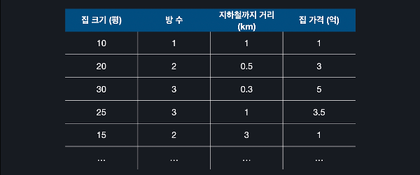 각각 $x_1, x_2, x_3$이라고 이름을 붙여 보자. 그리고 목표 변수는 똑같이 집의 가격이다.
