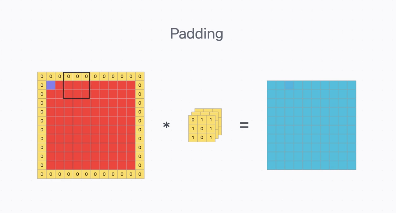 보통은 0으로 채워주는 경우가 많은데, 가장자리에 Padding을 해주면 입력 이미지의 크기 자체가 커지는 효과가 있다.