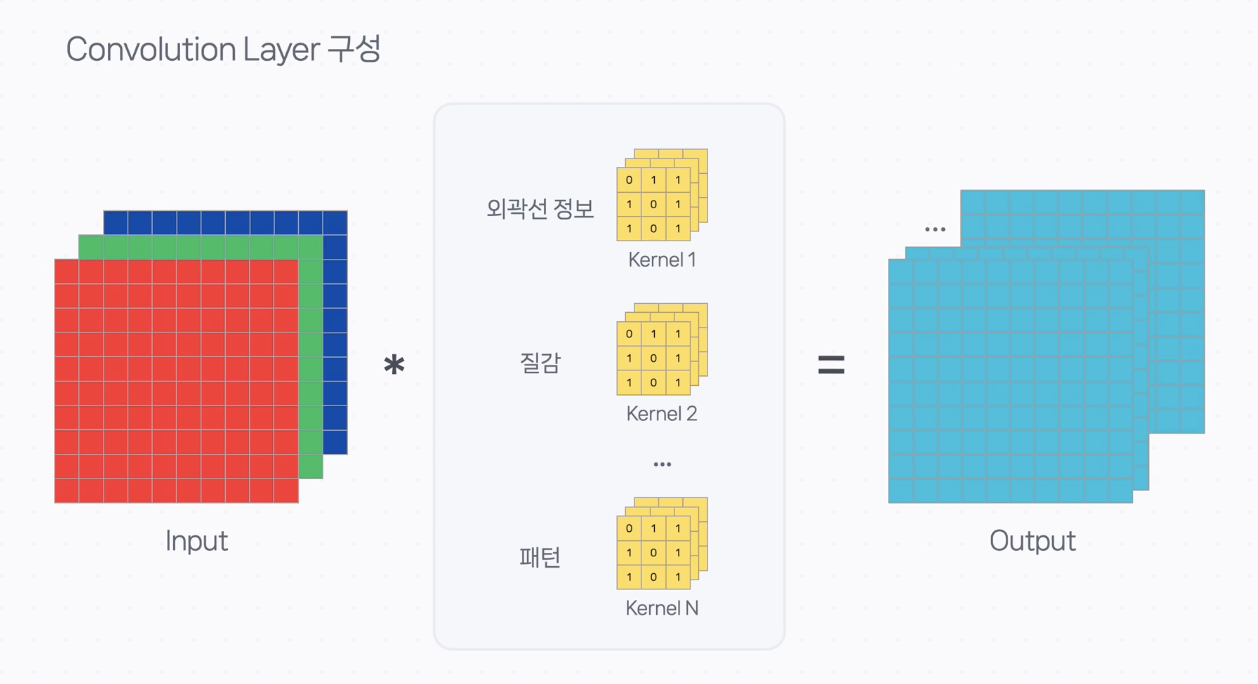 위에서 외곽선 정보, 색상 조합, 질감, 패턴 등 여러가지 시각적 특성을 추출할 수 있다고 했는데, 여러 특성을 학습하기 위해서는 여러개의 대응되는 kernel들이 필요하다.