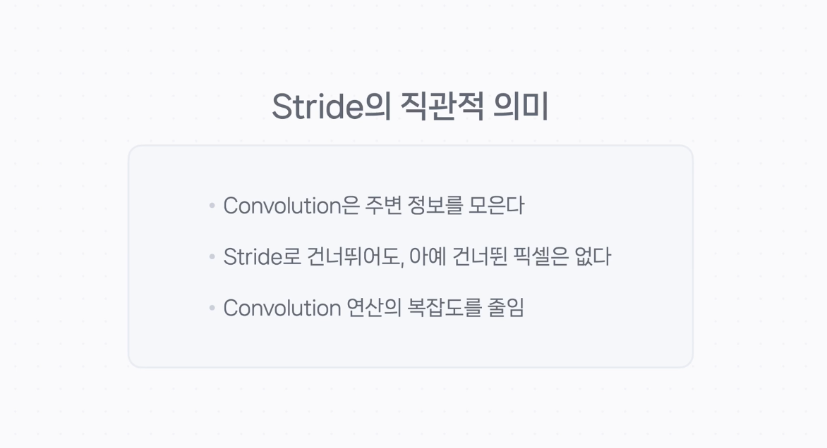 Convolution 연산은 Kernel 크기만큼의 주변 정보를 모아서 하나의 출력 픽셀로 전달하는 역할을 한다. 따라서 Stride가 2인 경우에 한 칸 건너 뛰어도 아예 정보전달이 되지 않은 입력값은 없는 것이다. 이처럼 Convolution 연산의 계산량을 조금 줄일 수 있고, 어느 정도 효율적으로 이미지의 특징을 추출할 수 있게 된다.