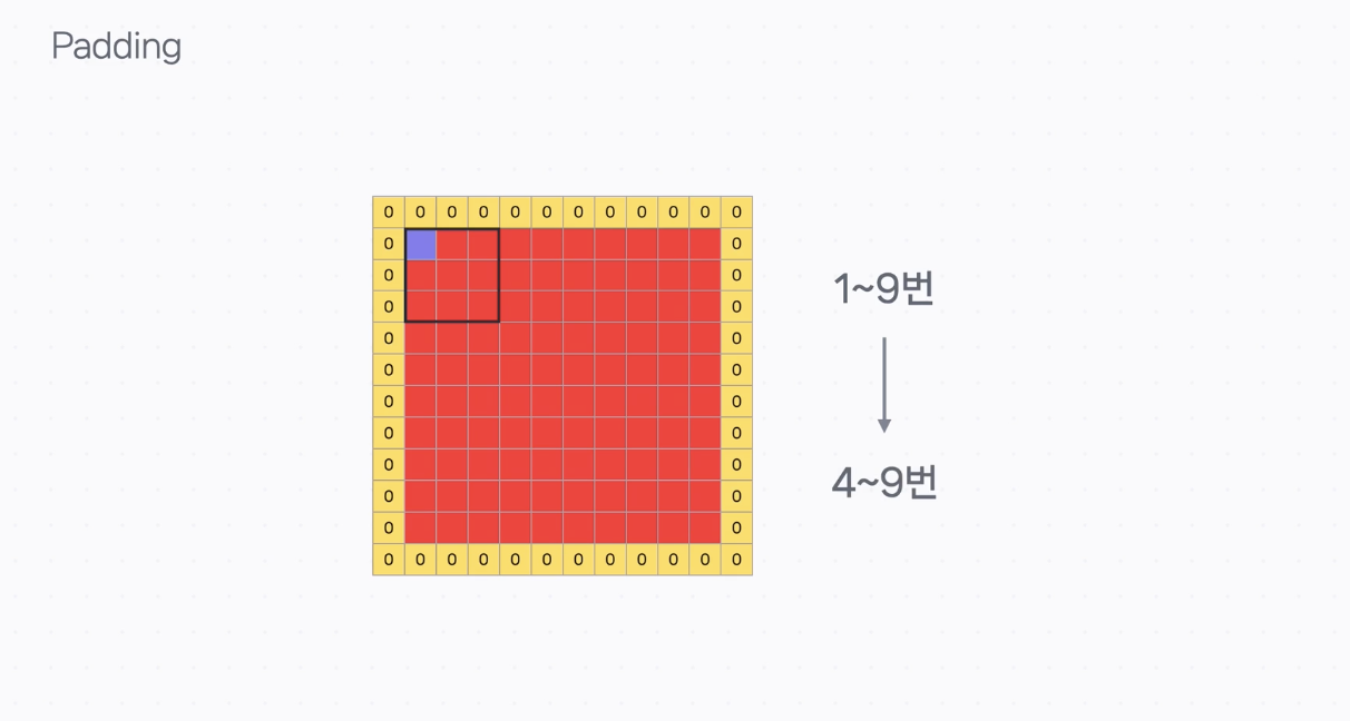 원래는 위치별로 1~9번 사이로 사용되었지만, Padding을 한 이후에는 각 위치에 있는 값들이 4~9번 사이로 사용되게 된 것이다.