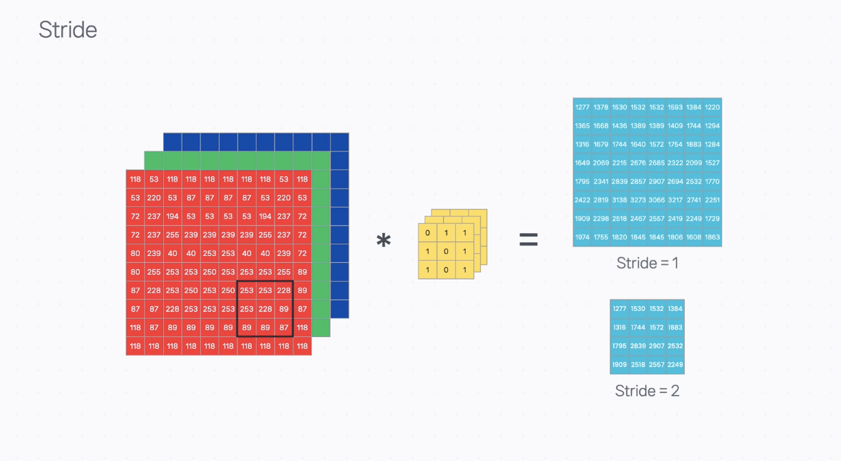 stride의 기본값은 1이며, stride가 2일 경우 Filter가 두 칸씩 이동하게 된다.
