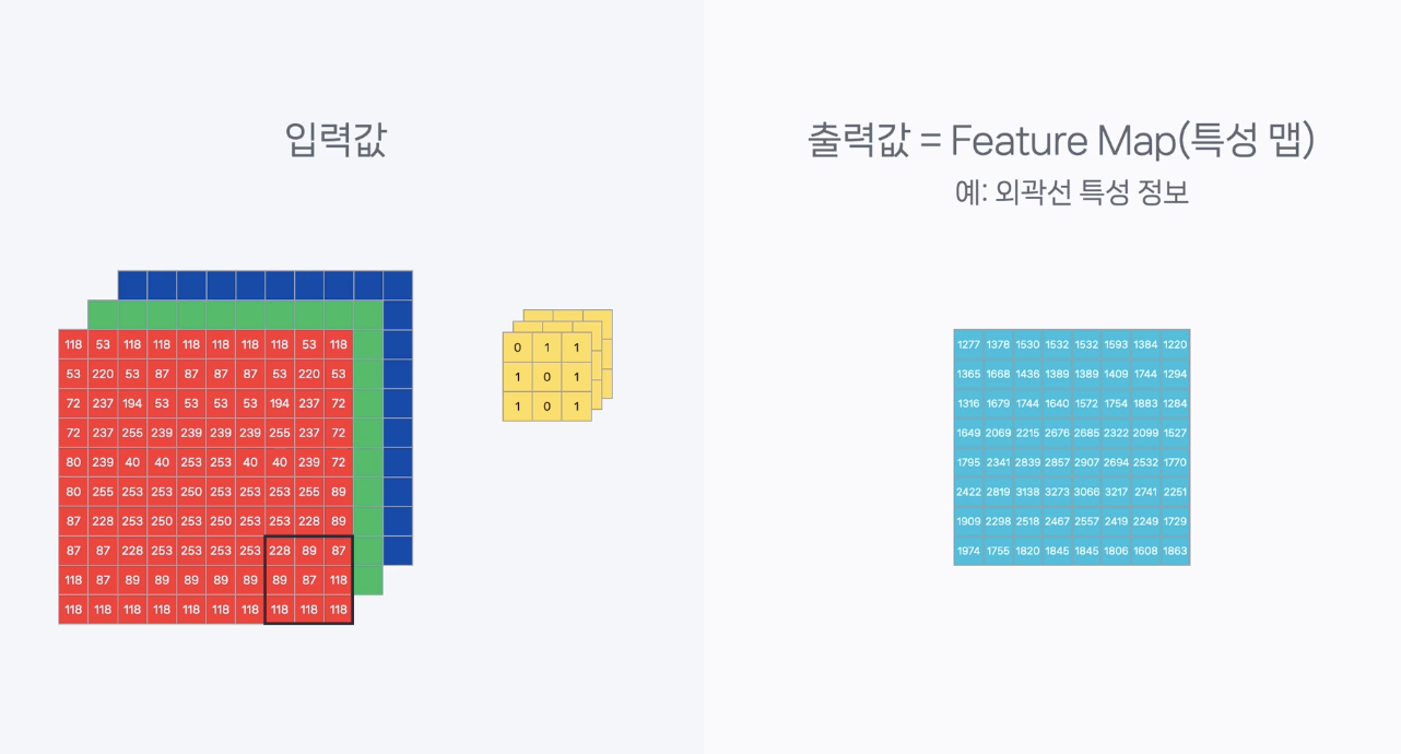 그리고 여기 Kernel에 있는 값들은 고정된 값이 아닌, 추후 모델이 데이터를 통해 학습하는 파라미터이며, 이미지의 특징을 가장 잘 파악할 수 있는 방향으로 바뀌게 된다.