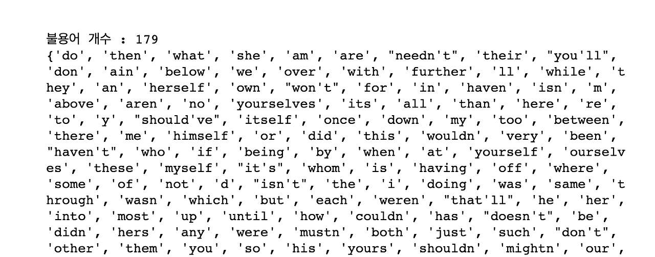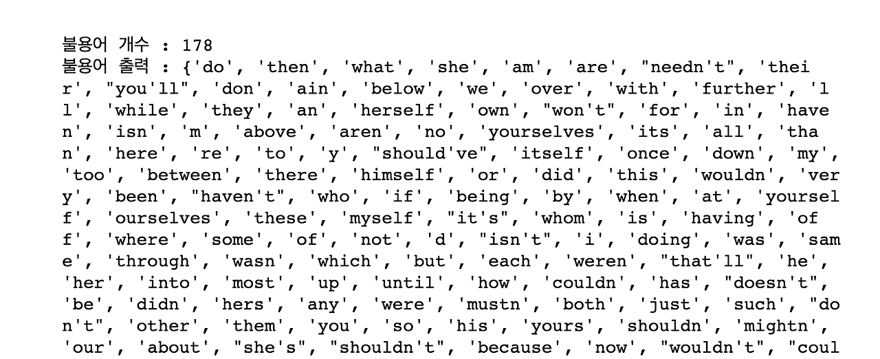 일반적인 코퍼스에서 많이 사용되지만 분석에 크게 활용되지 않는 단어들이 불용어 세트에 포함되어 있는 것을 확인할 수 있다.