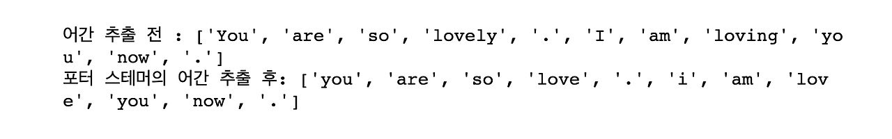 lovely와 loving이 love로 어간 추출 되었습니다. 서로 다른 두 개의 단어가 하나의 어간으로 정규화 되ek.
