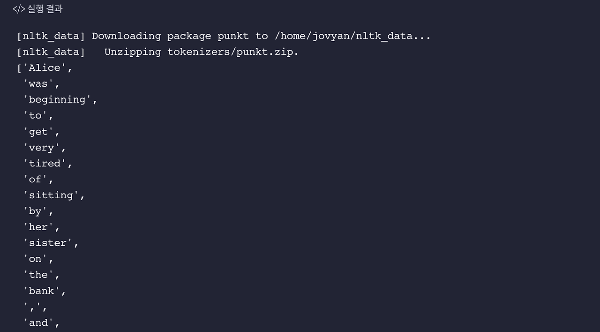 tokenized_words = word_tokenize(text) # word_tokenize(): 코퍼스를 파라미터로 넘겨서 토큰화 된 단어 리스트를 반환하는 함수