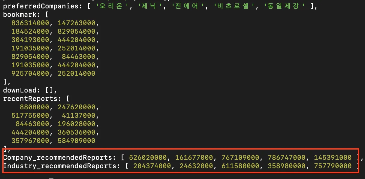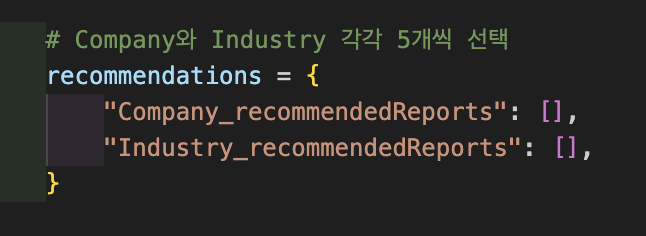 기업별, 산업별 각각 5개씩 추천 레포트가 생성되도록 추천 알고리즘을 적용해보았다.