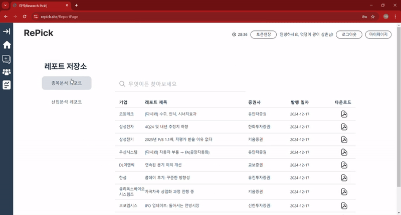 로그인을 하게 되면, 추천 알고리즘에 의해 개인이 저장한 북마크, 추천 산업/기업 레포트에 따라
