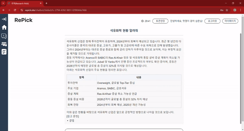 챗봇에서는 여러 레포트를 종합하여 종목과 산업을 알려주지만,