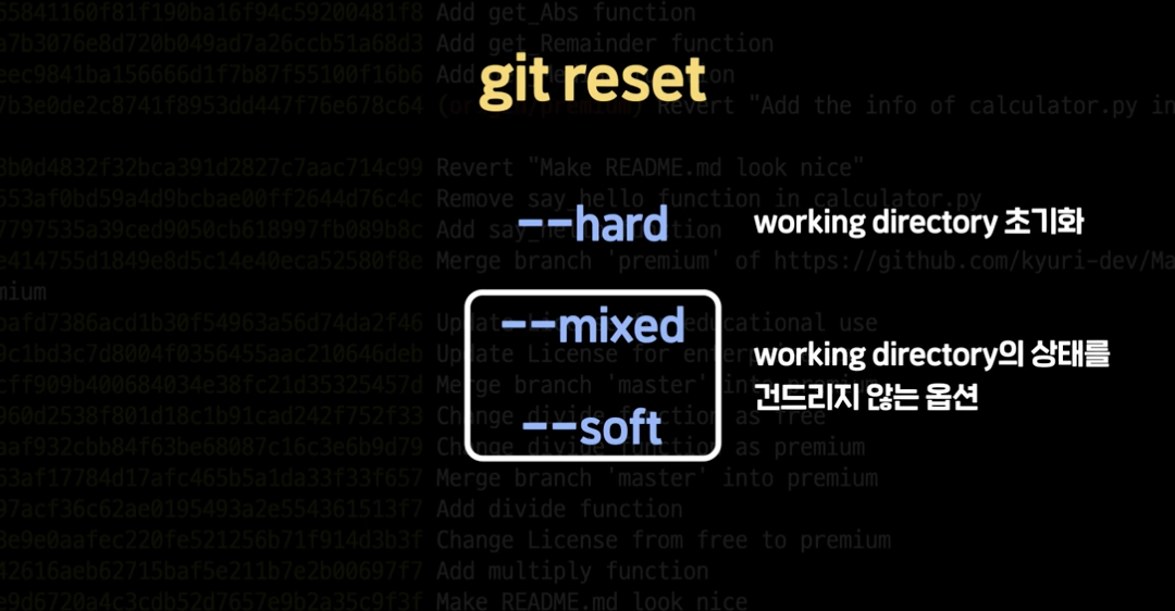git reflog: HEAD가 가리켰던 commit들의 id 확인하기, 헤드가 이때까지 가리켜왔던 커밋들을 기록한 정보(reference log의 줄임말)git log --pretty=oneline --all: 모든 브랜치의 log 기록 출력--graph: 커밋 히스토리가 각 브랜치와의 관계가 잘 드러나도록 그래프 형식으로 출력git log --pretty=oneline --all --graphgit rebase: 베이스를 다시 지정하다. 커밋을 재배치한다. -> 프리미엄 브랜치의 베이스를 테스트 브랜치로 재지정git rebase --continue: 컨플릭트가 발생해서 제대로 진행되지 못한 리베이스를 계속 진행하라.